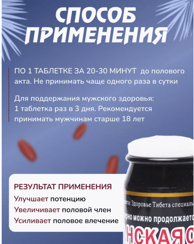 Способ применения: Для быстрого действия и ожидаемого эффекта пейте по одной таблетке за 10-30 минут до сексуального контакта (запивать подогретой водой). Если после финала соития эрекция продолжается (без эякуляции) выпейте несколько стаканов холодной воды.