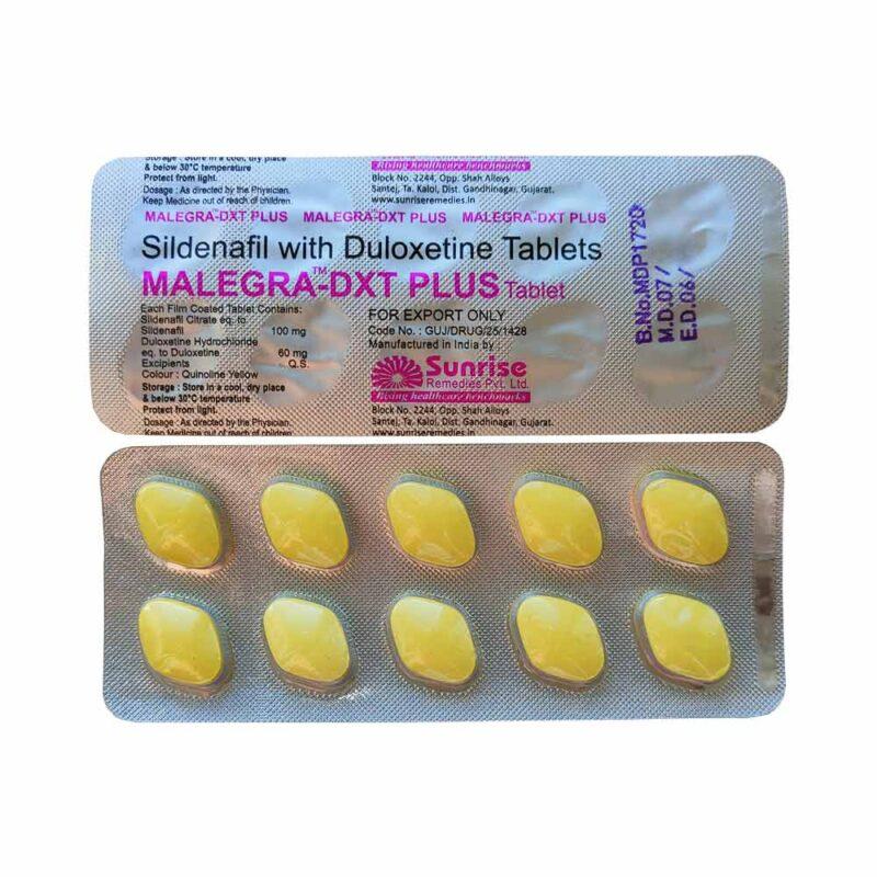 Malegra-DXT выпускается в форме классических таблеток. В 1 блистере упаковано 10 таблеток. Всякая таблетка содержит 100 мг Силденафила и 30 мг Дулоксетина. Это стандартная дозировка, которую при необходимости дозволено уменьшить, поделив таблетку на части.